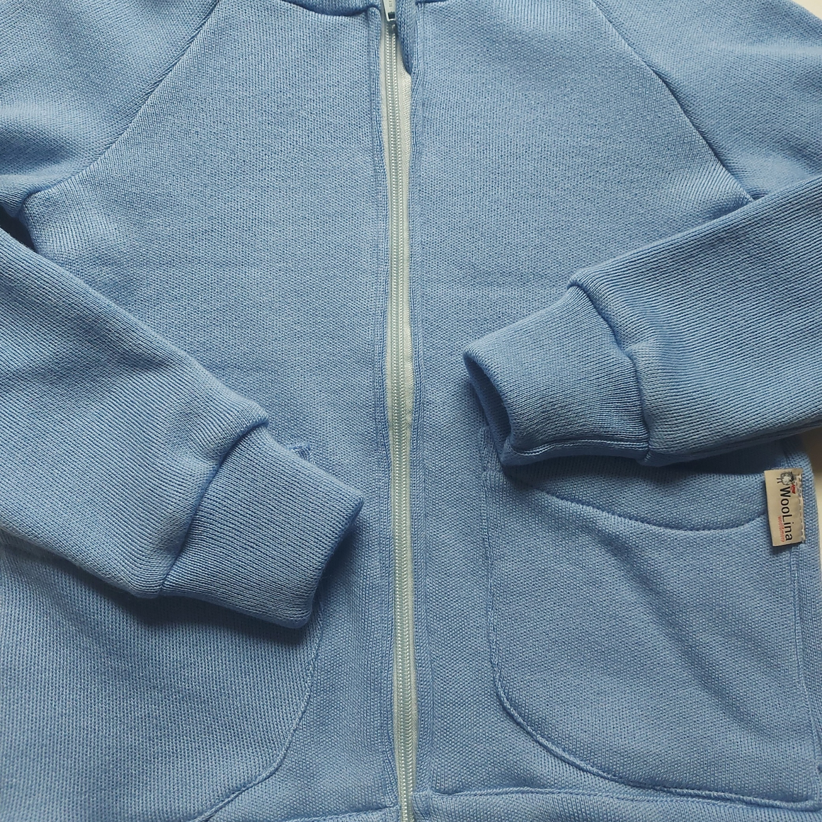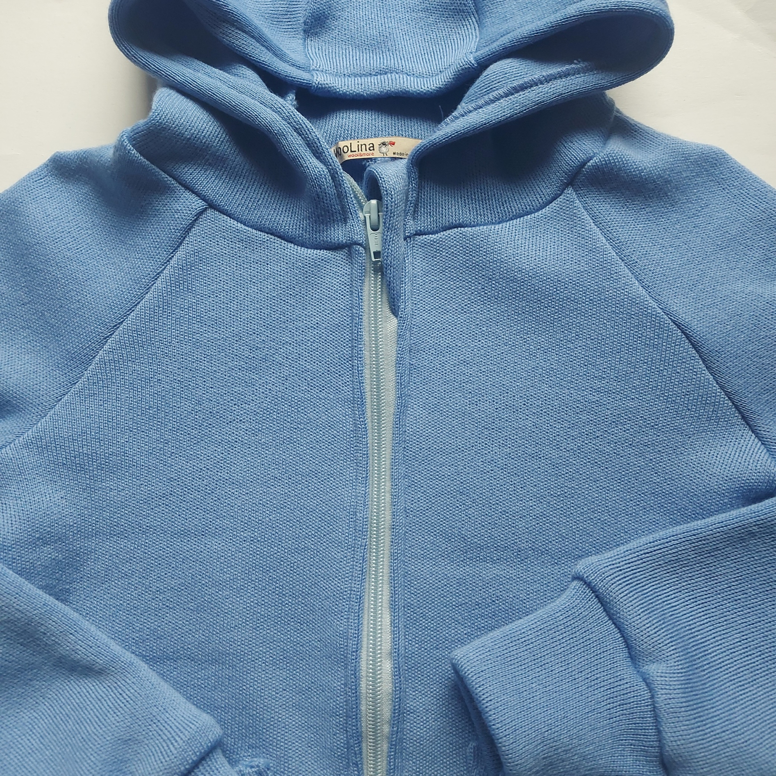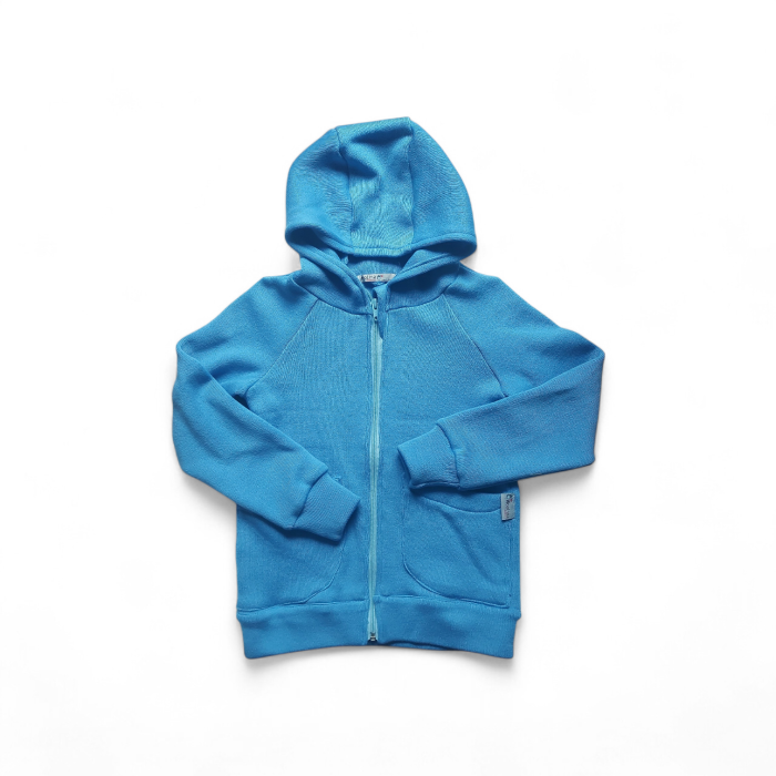 Cardigan cu glugă din lână merinos 100% extrafin, gsm 385 g/m2 (potrivit pentru strat 1). Se închide cu fermoar.