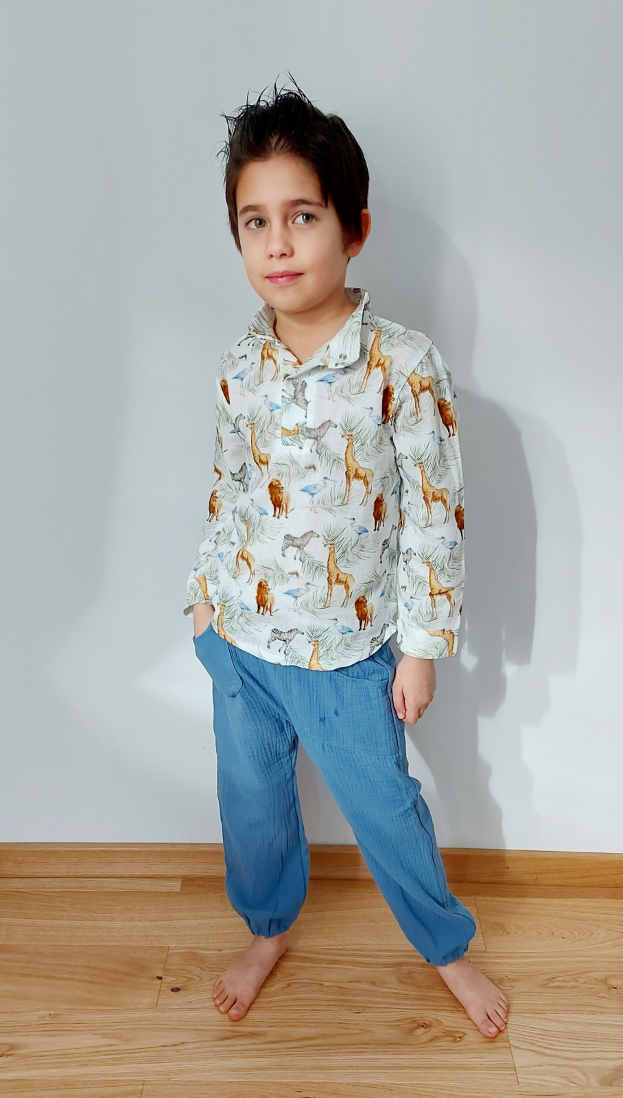 Cămașă cu mânecă lungă realizate din muselină de bumbac certificat Oeko Tex, închidere cu capse, nasturii sunt doar decorativi.